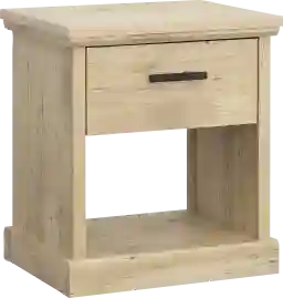 Yes, this nightstand features a single drawer equipped with metal runners and safety stops for a smooth, reliable glide. Below the drawer, an open bottom shelf provides a versatile display area for larger items like storage baskets or a stack of books, while the durable, 1-inch-thick top is built for dependable display of lamps and electronics.