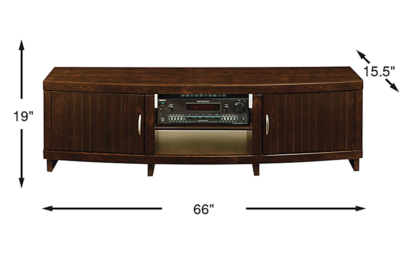 The Cliffside Park console delightfully combines timeless design and media storage. The generous 66" surface is ideal for a flat screen TV while the open shelves below welcome electronic components. Additional shelves are located behind each door. A rich espresso finish on wood solids gives the console wonderful eye appeal.