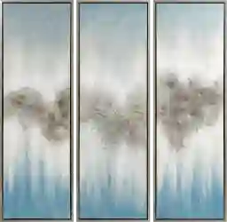 To maintain the visual flow of the abstract "Cloud Formation" design, we recommend spacing the three panels approximately 2 to 4 inches apart. This spacing is wide enough to let the silver frames stand out, yet close enough for the eye to perceive the three pieces as a single, cohesive statement.