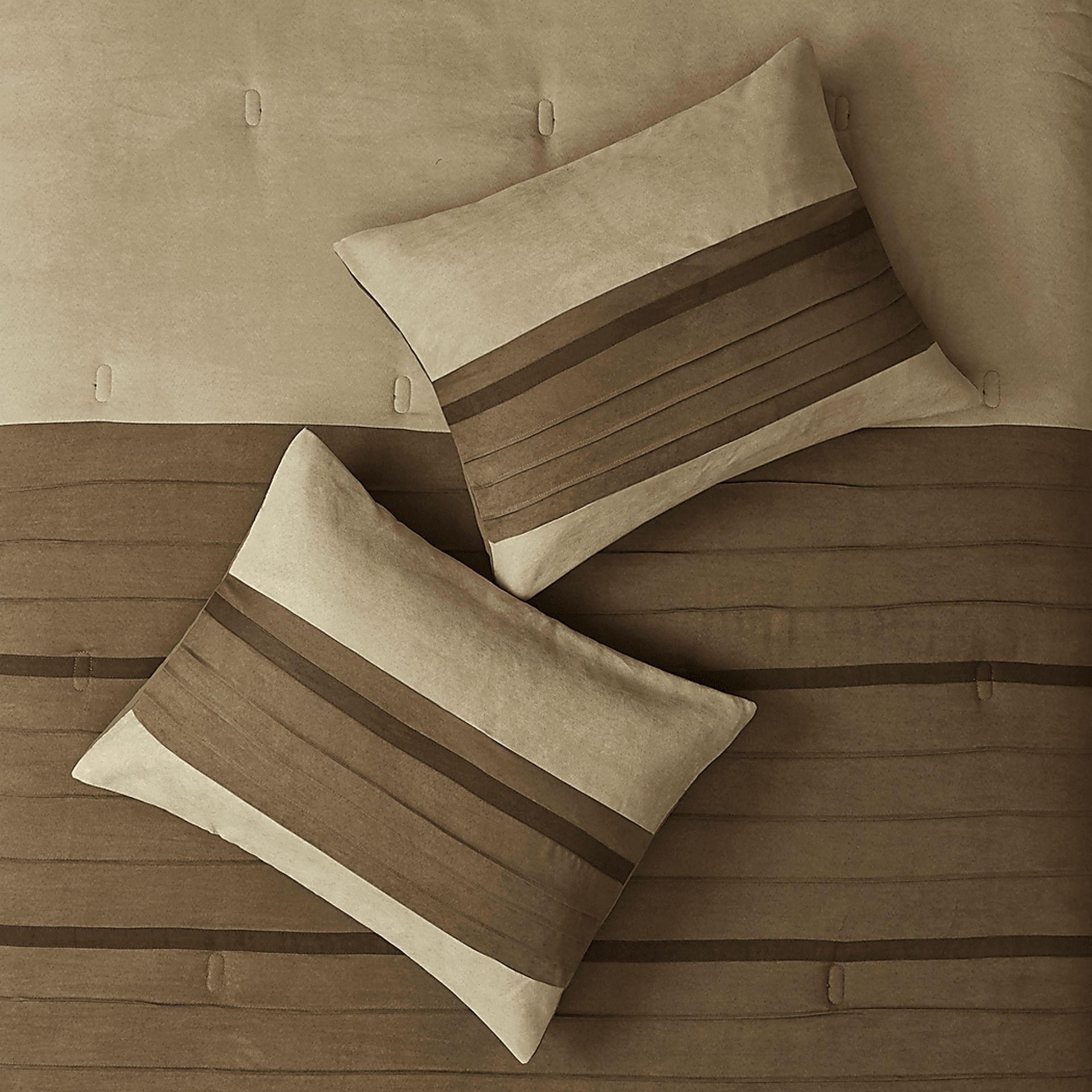 For comfort and a chic design, the Clouet bedding collection is the perfect fit. Its ivory comforter is made from pieced micro-suede for a soft feel while the piecing details add texture and color with their taupe and brown colorways. The decorative pillows add a mix of nature-inspired leaves and solid neutrals to combine perfectly with this collection. Customer assembly required.
