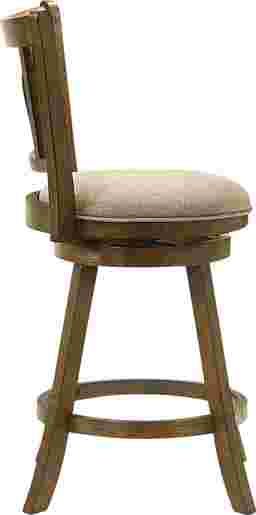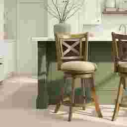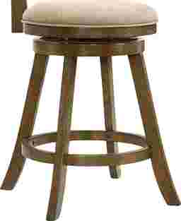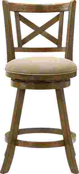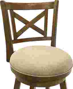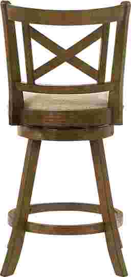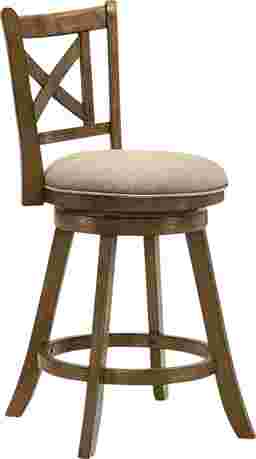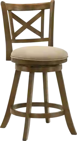 The Cloverprises counter stool captures the warmth of classic design with the durability and comfort required for modern living. Its elegant X-back frame and gently curved legs bring a timeless farmhouse charm, while the sleek round seat and 360-degree swivel base add functionality for everyday use. Whether placed at a kitchen island or a home bar, Cloverprises delivers a perfect balance of style, comfort, and craftsmanship. Built from solid natural wood with a rich brown finish, each stool showcases a warm tone that enhances natural wood character while offering strength and long-lasting performance. The seat is upholstered in a neutral fabric that pairs beautifully with the finish and easily blend with a variety of color palettes. The performance-grade fabric offers soft comfort while resisting wear, helping maintain its appearance through years of use. The 360-degree swivel seat allows for smooth rotation, making conversation easy and movement effortless, while the circular footrest