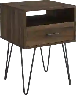 The Clyburn side table features a convenient combination of open and closed storage. The one drawer has metal glides for easy opening. On top of multiple storage options, this modern end table also has a rich sense of character with sleek metal hairpin legs. Customer assembly is required.