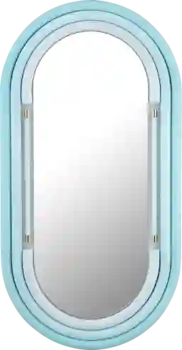 While this mirror is a stunning decorative accent, the frame is constructed from wood and iron. In extremely humid climates or bathrooms without proper ventilation, persistent moisture can lead to warping of the wood or "desilvering" of the glass over time. To preserve the vibrant blue finish and the integrity of the frame, we recommend placing it in well-ventilated areas or "dry" zones like bedrooms, dining areas, or living rooms.