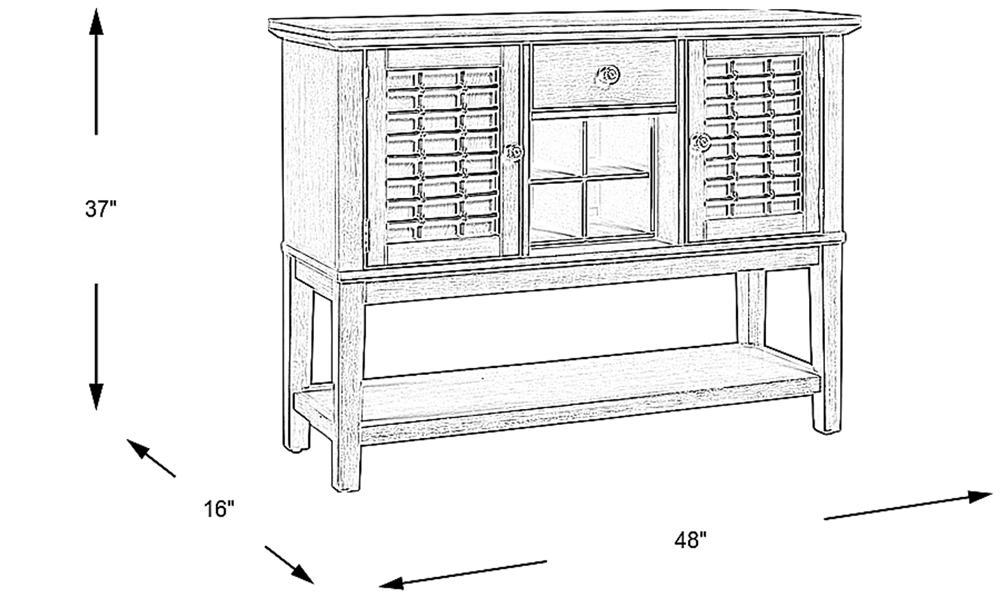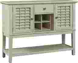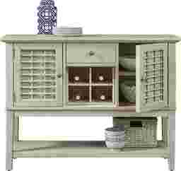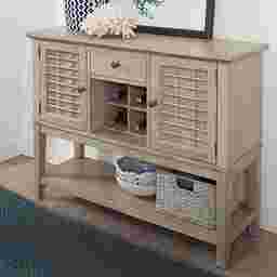 Enhance your kitchen or dining room area with the Coastline Drive sideboard. Featuring four wine cubbies, two shelved cabinets, a versatile pull out drawer and wide base shelf, this enchanting piece is defined by its supreme storage capabilities. Its construction of wood solids and oak veneers, neutral sandy gray finish and rattan panel accents blend coastal and transitional styles with ease, while gleaming metal hardware adds a vintage inspired touch.