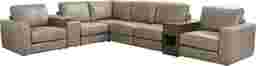 Confident forms and inviting comfort find one another on the Venice Modular, where intentional design details and unique mixed materials blend into a space with a perfect balance of comfort and contemporary grace. Each seat features cobblestone-colored top grain leather where the body touches, with luxurious accents like welted seams and decorative top stitching throughout. A contrasting console with dark brown woodgrain features a swivel table, USB charging and plenty of hidden storage space for incredible convenience. Also included, a media console expands on the experience with wireless charging, hidden cupholders, lift-top storage, and bluetooth-enabled audio with built-in controls. With wonderful efficiency, easy-to-use modular connectors make it simple to reconfigure this seating solution to fit your needs and taste anytime. Includes LAF chair, 3 armless chairs, non-media console, media console, wedge, and RAF chair. Upholstery: top grain leather where the body touches with polyurethane sides and back.