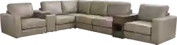 Beyond its electronic capabilities, this sectional offers thoughtful physical conveniences. One console features a dark brown woodgrain finish and a swivel table, perfect for a laptop or snacks. For movie nights, the media console includes hidden cupholders that can be tucked away when not in use, maintaining the sectional’s clean, contemporary lines while providing essential functionality.
