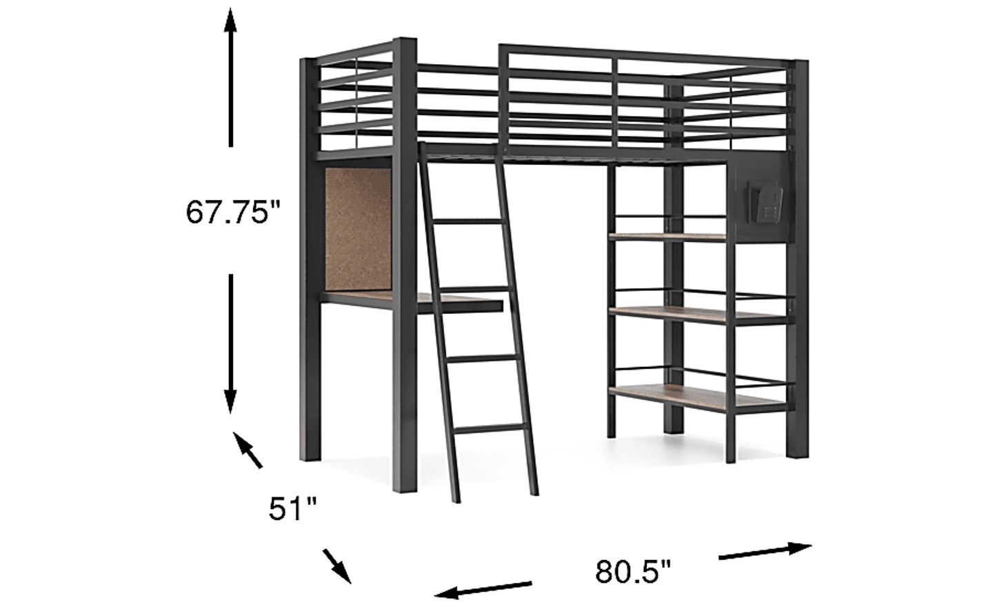 Designed to save space and explore creativity, the Colefax Avenue loft bed features clean lines and a sleek contemporary design. Constructed of a metal frame in a chic gray melamine finish, the twin-sized bed is flanked with side rails and a sturdy ladder. A built-in desk and corkboard make it easy to complete homework assignments or art projects, while three wooden shelves are great for displaying favorite books, trophies, or other beloved items.