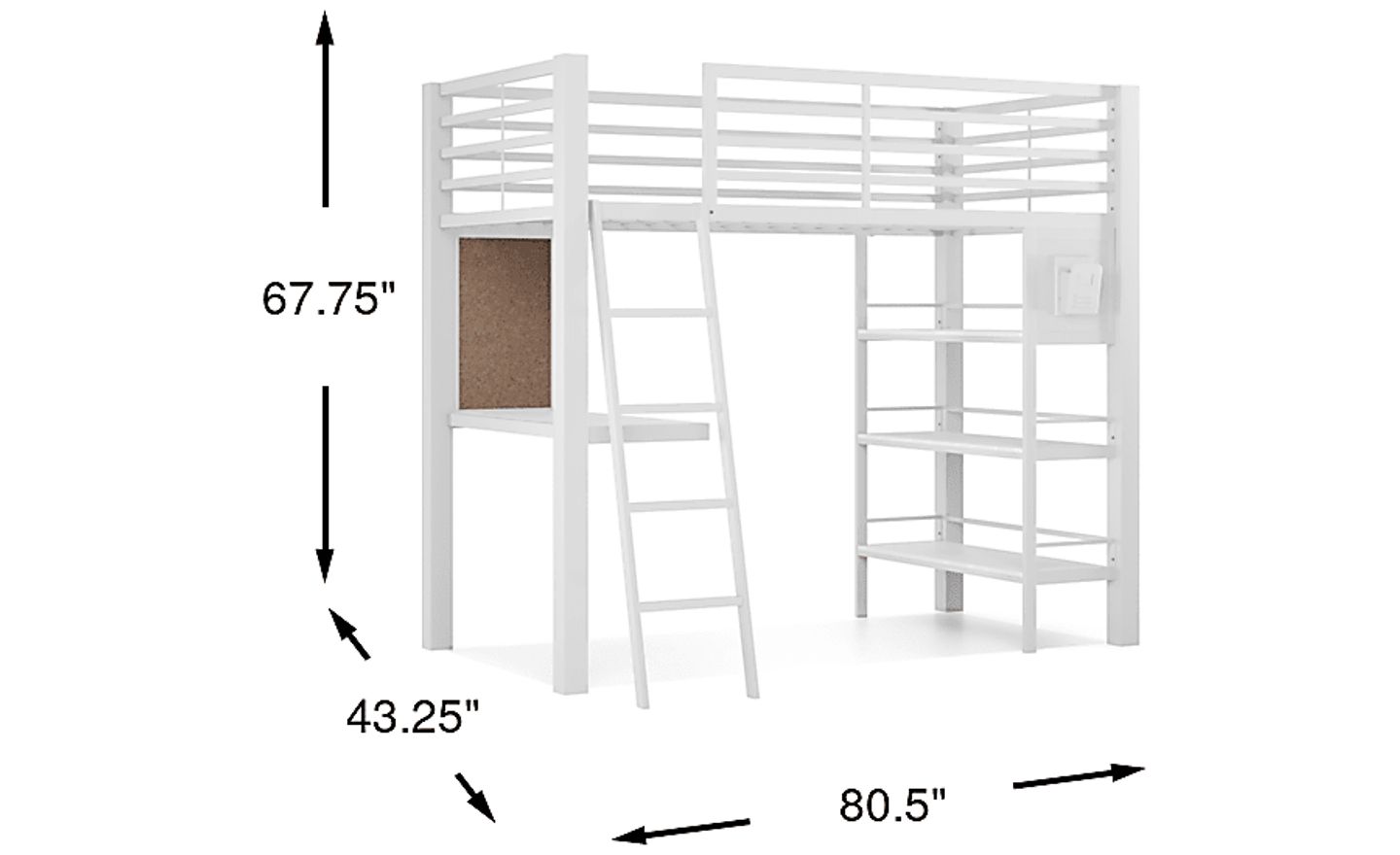 Designed to save space and explore creativity, the Colefax Avenue loft bed features clean lines and a sleek contemporary design. Made with a metal frame in a chic white melamine finish, the twin-sized bed is flanked with side rails and a sturdy ladder. A built-in desk and corkboard make it easy to complete homework assignments or art projects, while three wooden shelves are great for displaying favorite books, trophies, or other beloved items. Mattress and foundation (if required) sold separately.