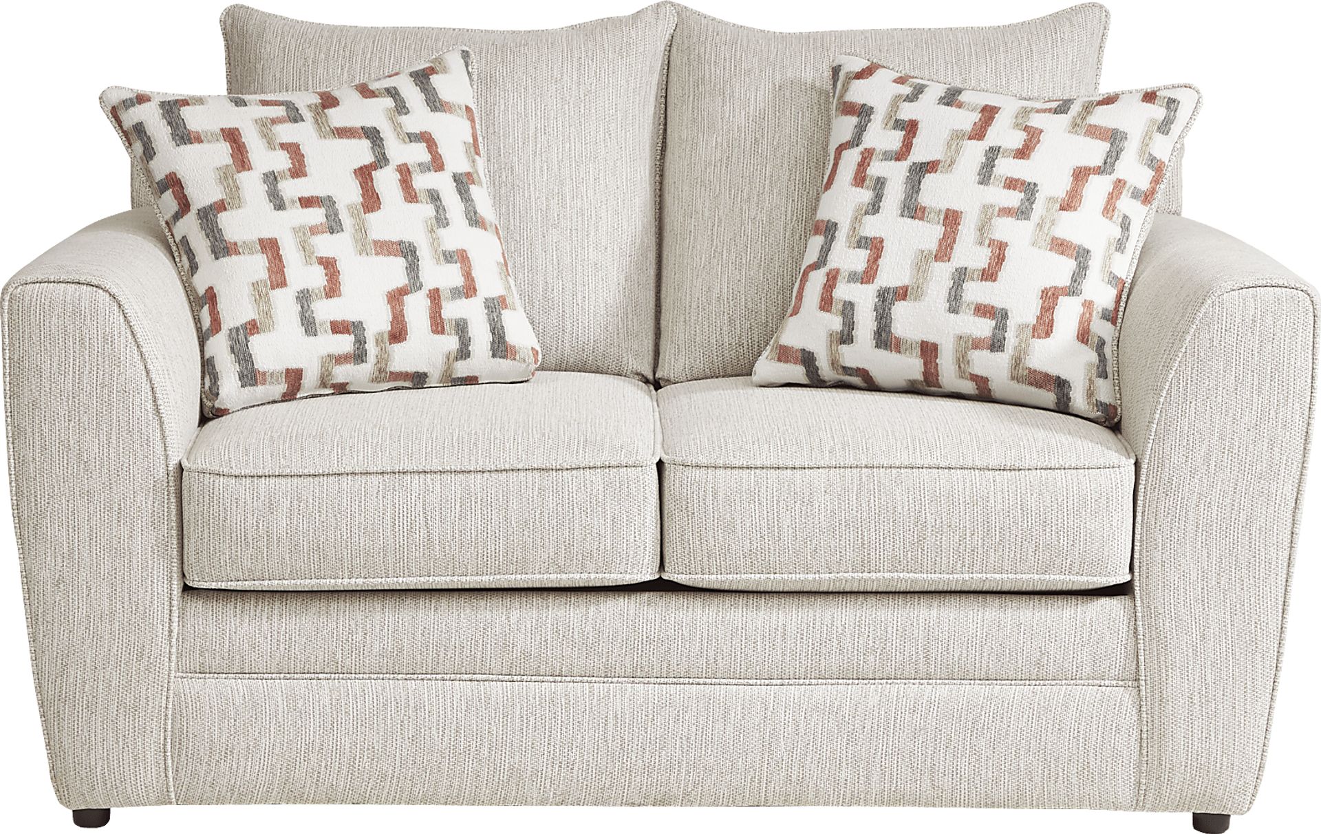 Complete your living space with the Colesby loveseat. Perfect for two, this piece boasts cozy and casual comfort. Double welted detailing outlines the woven upholstery as reversible seat cushions ensure long-lasting style. Orange and gray geometric-patterned pillows add character to the contemporary style. Upholstery: 80% Polypropylene, 20% Polyester