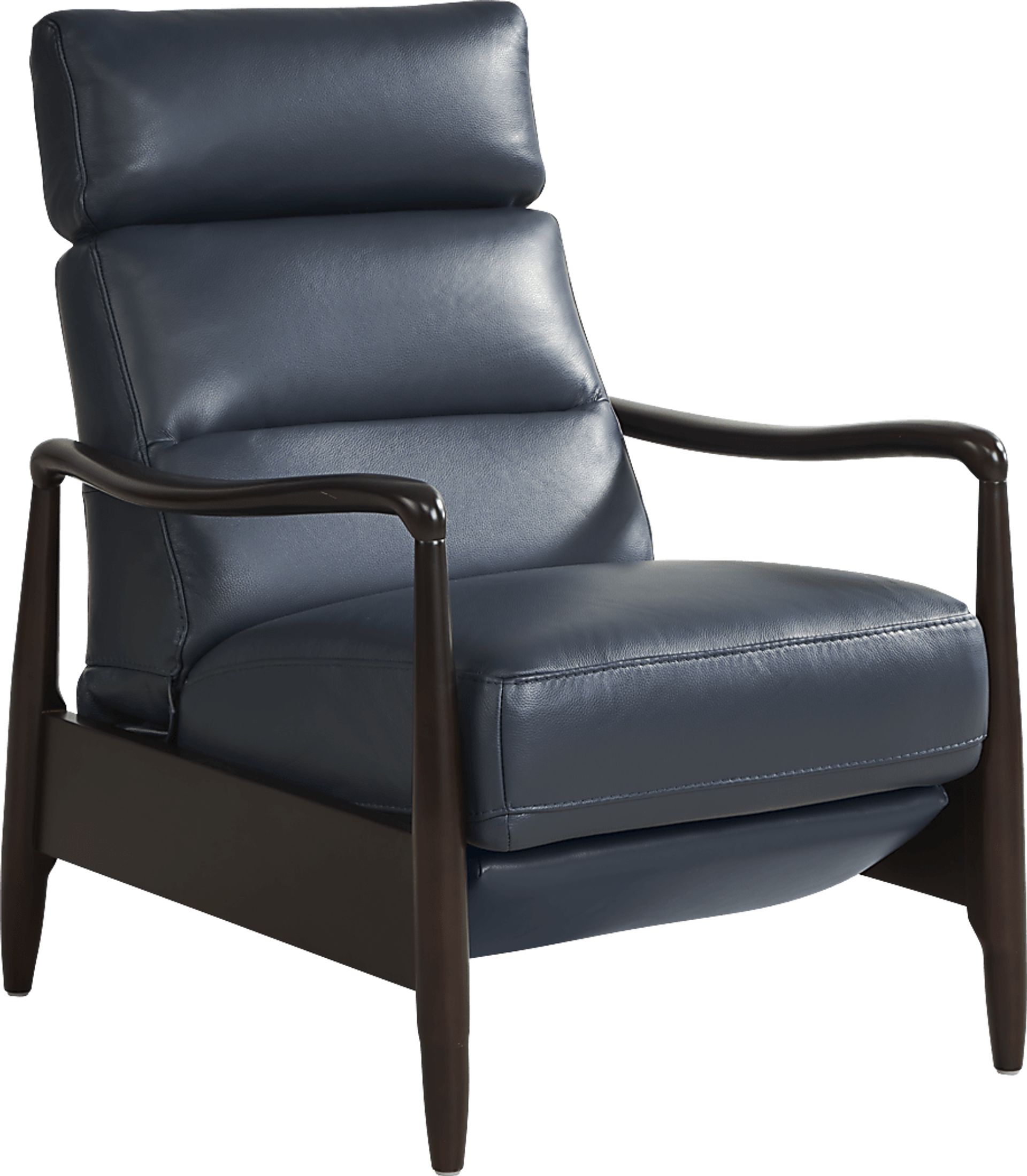 Ease into rich, pillowy comfort and total relaxation anywhere you put the Coleston non-power recliner. Upholstered in blue top grain leather where the body touches, the transitional style is accentuated by smooth wood arms in a dark brown finish. A sumptuous piece, it's as easy to enjoy in the living room with family and friends as it is in your private office with a good book. Upholstery: Top grain leather where the body touches, vinyl sides and back.