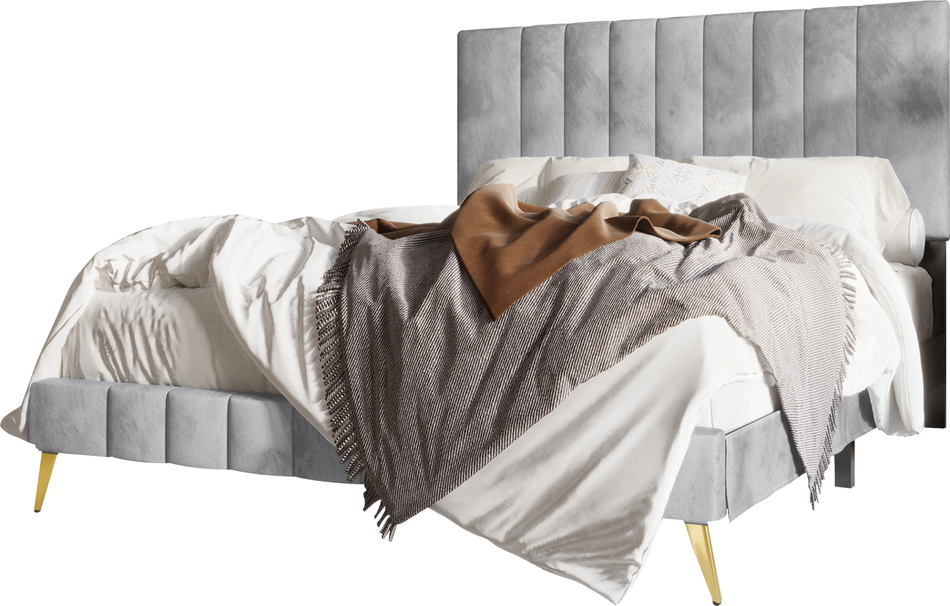 The front footboard features gold metal tapered legs that offer both aesthetic and practical benefits. Beyond providing a sophisticated, contemporary contrast to the light gray upholstery, the leg height allows for easier access under the bed for cleaning, which is essential for maintaining a dust-free sleeping environment.