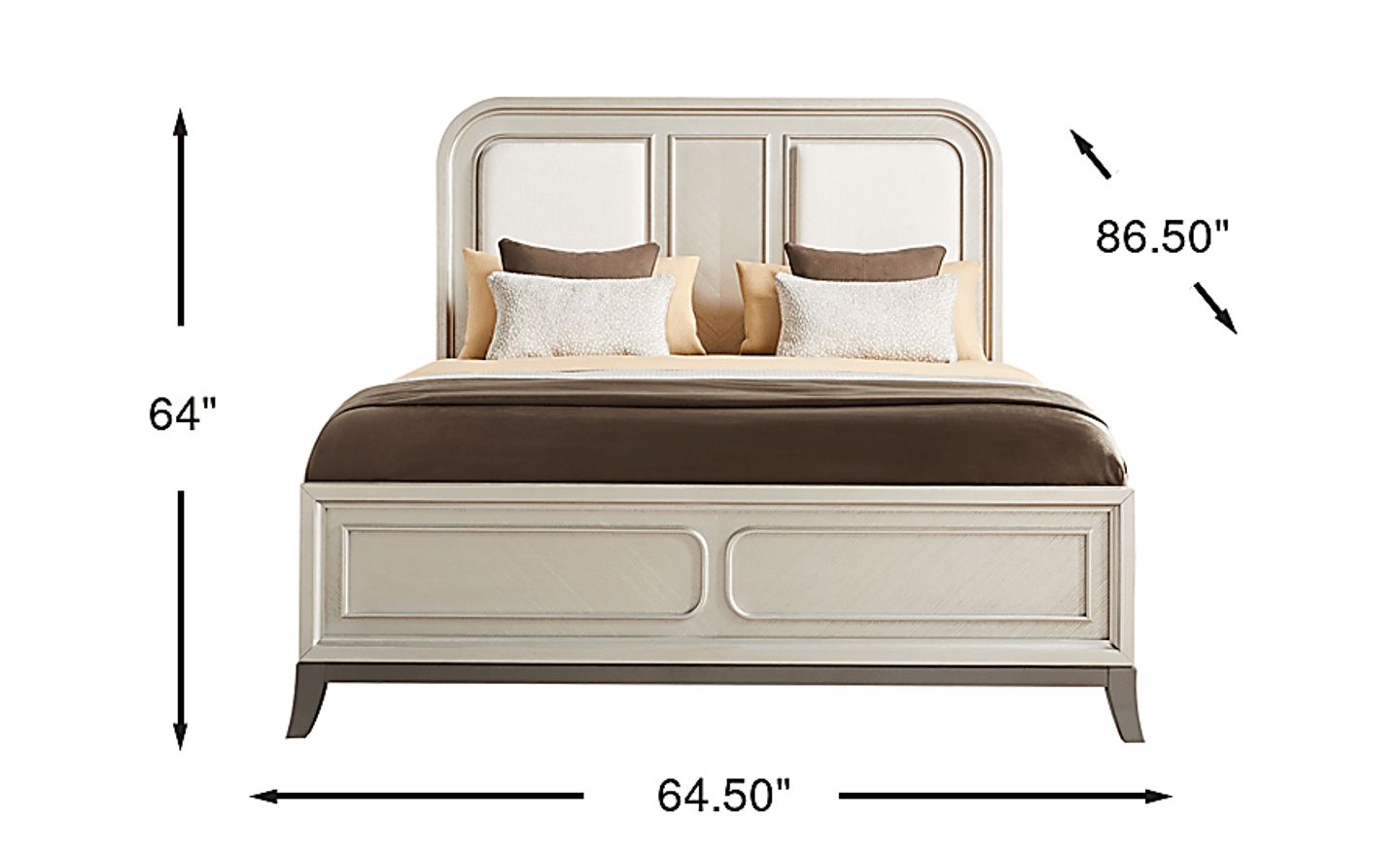 With a width of 64.5 inches and a depth of 86.5 inches, this bed offers a grand contemporary look without an overly bulky footprint. Its tapered legs and light-reflective silver finish help create a sense of openness, making it a great choice for smaller primary suites or city apartments. To ensure a comfortable layout, we recommend measuring your room to allow for at least two feet of walking space around the perimeter of the bed.