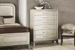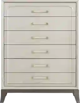 With six drawers, this chest offers versatile organization for a full wardrobe. The vertical arrangement is perfect for separating clothing by type; the top drawers provide convenient access to daily essentials and accessories, while the deeper drawers are spacious enough to accommodate bulkier items like sweaters, sweatshirts, and denim. The silver metal bar pulls are designed for both aesthetic poise and ease of use.