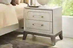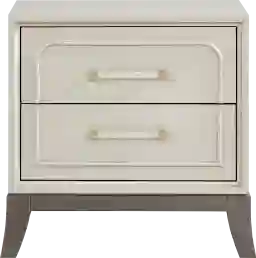 The serene glow of early morning light reflecting off city windows finds its form in the Colette collection's sculptural elegance and sophisticated ease. Contemporary in style, this two-drawer nightstand is crafted with beautiful ash veneers in a soft silver finish that radiates understated glamour. A sleek silhouette paired with tall, angled legs in a dark gray finish create a graceful contrast that grounds the look. USB charging ports offer convenient overnight charging, while silver metal bar pulls adorn each drawer for a poise final touch.