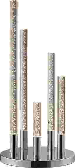 The Colfax Peak Silver 5-Light Lamp transforms your décor with a dazzling display of modern elegance. The polished chrome base supports three radiant acrylic cylinders; each infused with bubble accents that catch and reflect the light beautifully. When illuminated, the integrated LEDs create a shimmering glow that feels both sophisticated and striking-a true statement piece that brings brilliance to any room. The in-line full-range dimmer switch makes it easy to adjust the lighting to suit your desired ambiance. Partial assembly may be required.