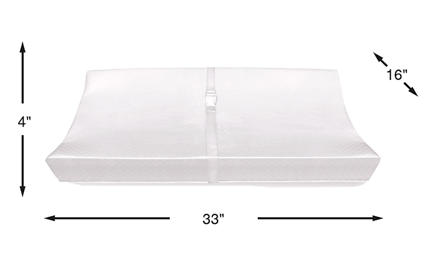 This pad measures 33"L x 16"W, which is a standard size engineered to fit most nursery dressers and changing tables. At 4 inches high, the contoured ridges provide a secure boundary without being overly bulky, making it a versatile addition that fits seamlessly into most nursery layouts.