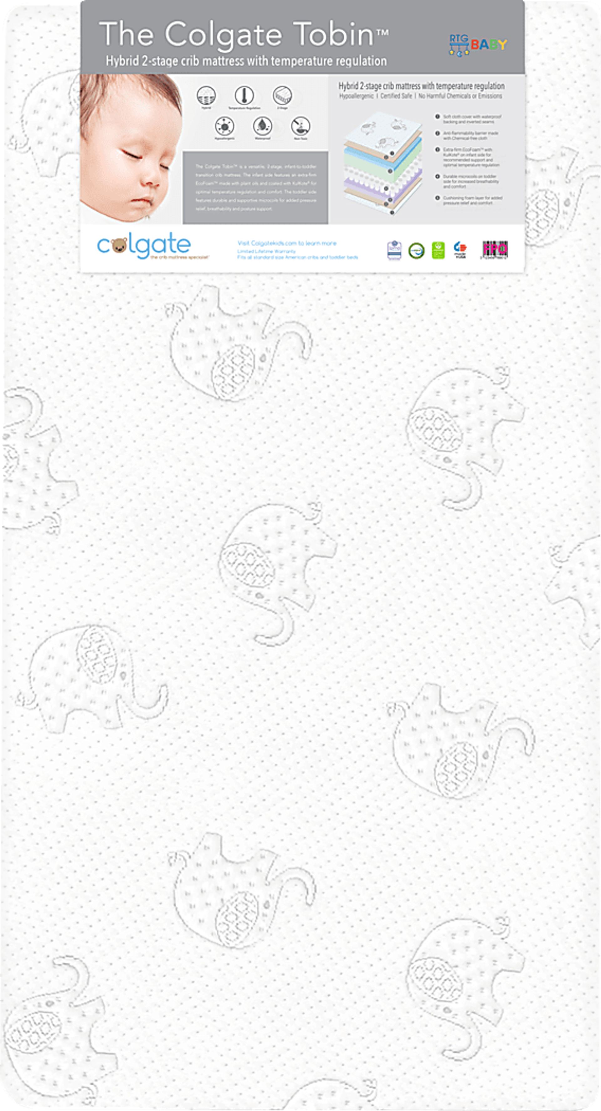Safe and eco-friendly, the Colgate Tobin™ crib mattress offers a versatile hybrid design that grows with your child. This adaptable 2-stage mattress has one side specially designed for infants, while the other is ready for their toddler days. Anti-inflammable and hypoallergenic, its soft cloth cover is both durable and chemical-free. Inverted seams ensure its waterproof barrier lasts through the years. Made with plant-based oils, extra firm EcoFoam™ with KulKote™ delivers support and heat regulation for growing babies. On the other side, pocketed microcoils increase comfort and breathability for toddlers. An additional layer of cushioning foam helps relieve pressure and create a cradling feel. Embroidered elephants on the cover give this mattress an adorable finishing touch. Limited Lifetime Warranty - https://www.roomstogo.com/mattress/warranty/colgate