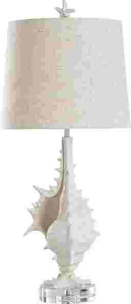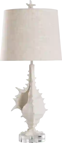 The Comlita White Lamp features an open conch shape sculpture that is mounted on a round base for an oceanic appeal. This light features a subtle white sand finish and offset heathered oatmeal shade for a soft, welcoming aesthetic. This niche lamp is perfect for a coastal styled home. Partial assembly may be required.