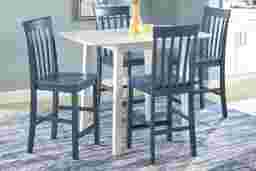 Simple, stylish and with a utilitarian flair for fun and intimacy, this Concord dining room makes space-saving design an art form. The contemporary, counter height set features 4 blue slat back stools and a white drop-leaf table designed to elevate large or small table spreads and make every meal a special one. Crafted in wood solids with a sleek finish, this sensible set adds a modern flair to any occasion.