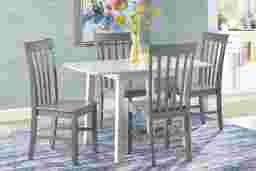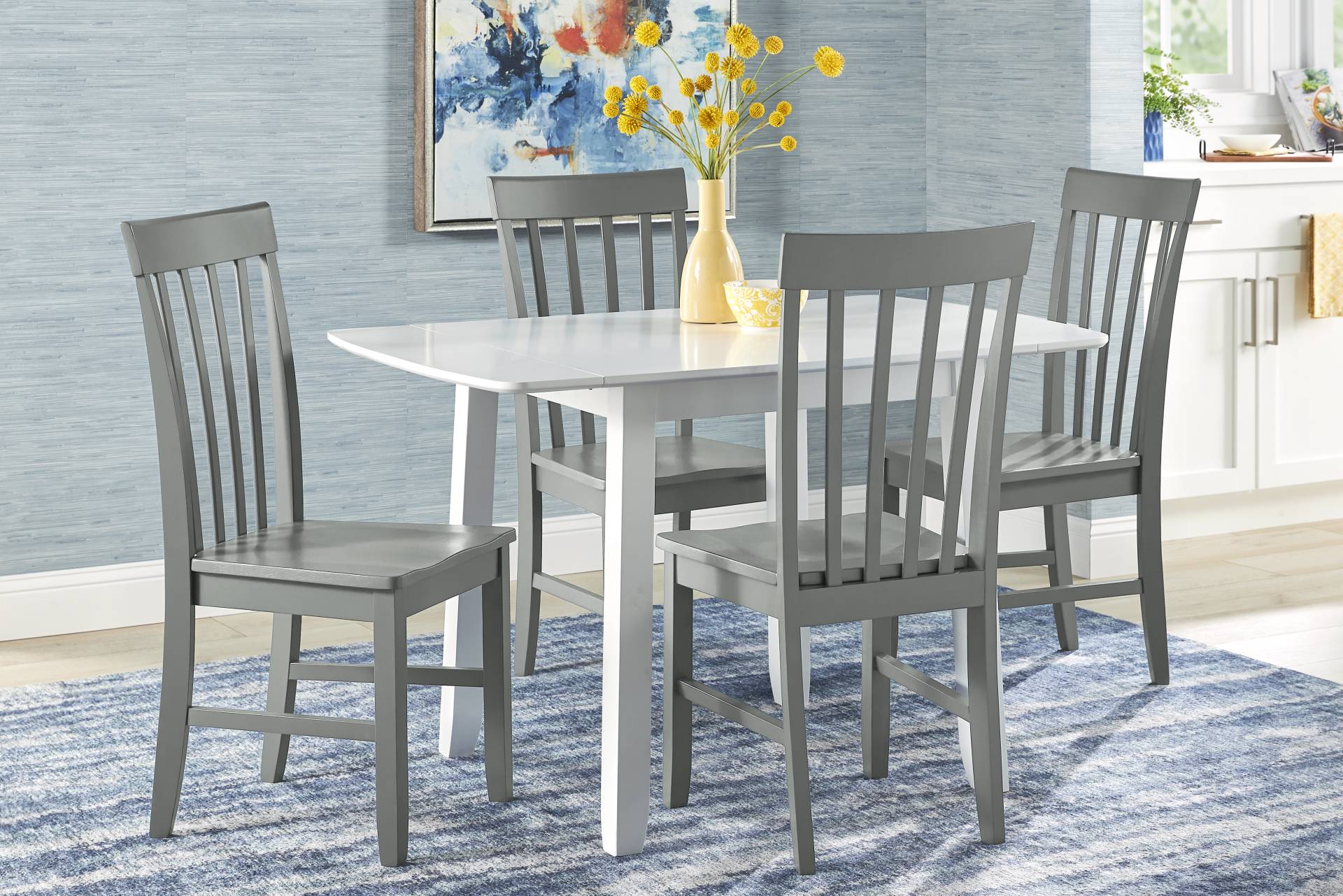Simple, stylish and with a utilitarian flair for fun and intimacy, this Concord dining room makes space-saving design an art form. The contemporary set features 4 gray slat back chairs and a white drop-leaf table designed to elevate large or small table spreads and make every meal a special one. Crafted in wood solids with a sleek finish, this sensible set adds a modern flair to any occasion with a footprint that's ideal for smaller spaces.