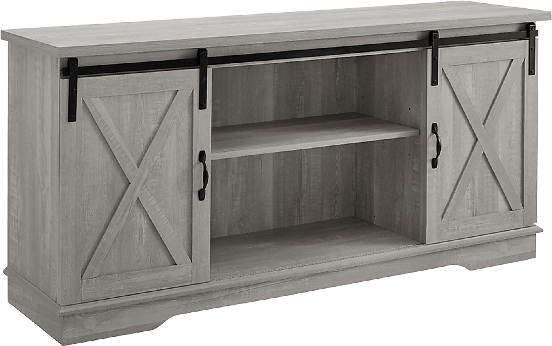 This Coneflower TV stand will give your living room a charming country feel, while also providing plenty of storage space for your electronics and decor. Featuring two sliding barn door styled cabinet fronts for a versatile design where you can either close off the middle or both sides, depending on your needs. Adjustable shelving and cable management make it simple for you to keep your electronics in one place. This media console is constructed of warp-resistant MDF. The modern farmhouse style of this entertainment center will become a piece in your living room you'll admire. Customer assembly is required.