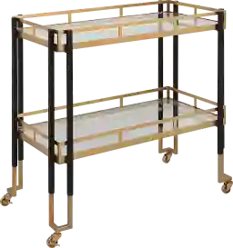 Featuring a clean lined solid iron frame, this Conti contemporary bar cart is finished in a two-toned matte black and brushed gold. Has two tempered glass shelves, complete with rolling and locking casters. Customer assembly is required.