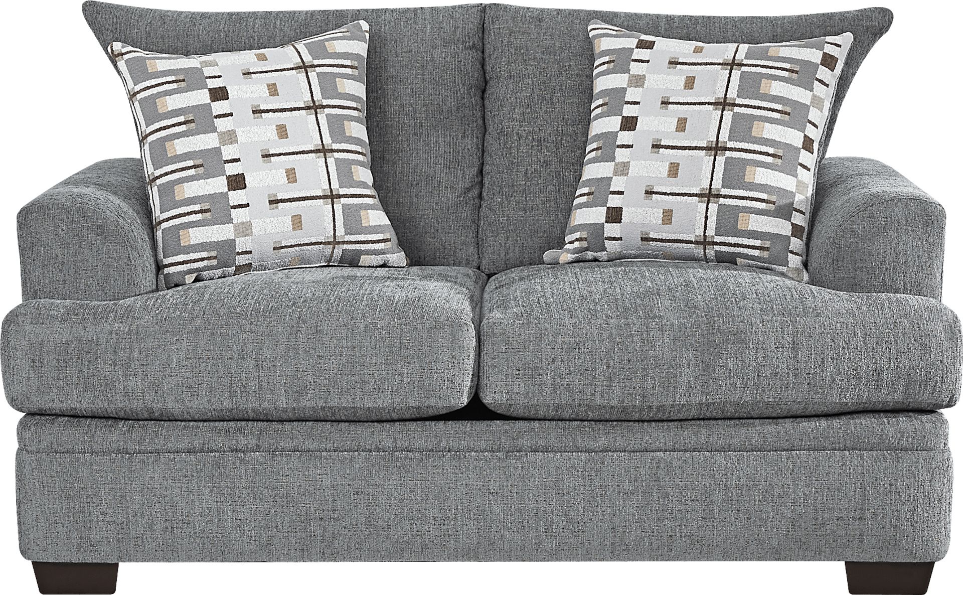 This contemporary piece features pillow-style back cushions and T-cushion seats designed for both comfort and longevity. The T-cushion design allows the seat to extend past the arms, providing extra legroom and a more stable seating surface. To keep your loveseat looking its best, we recommend occasionally fluffing the pillow backs and rotating the seat cushions to ensure even wear over time.