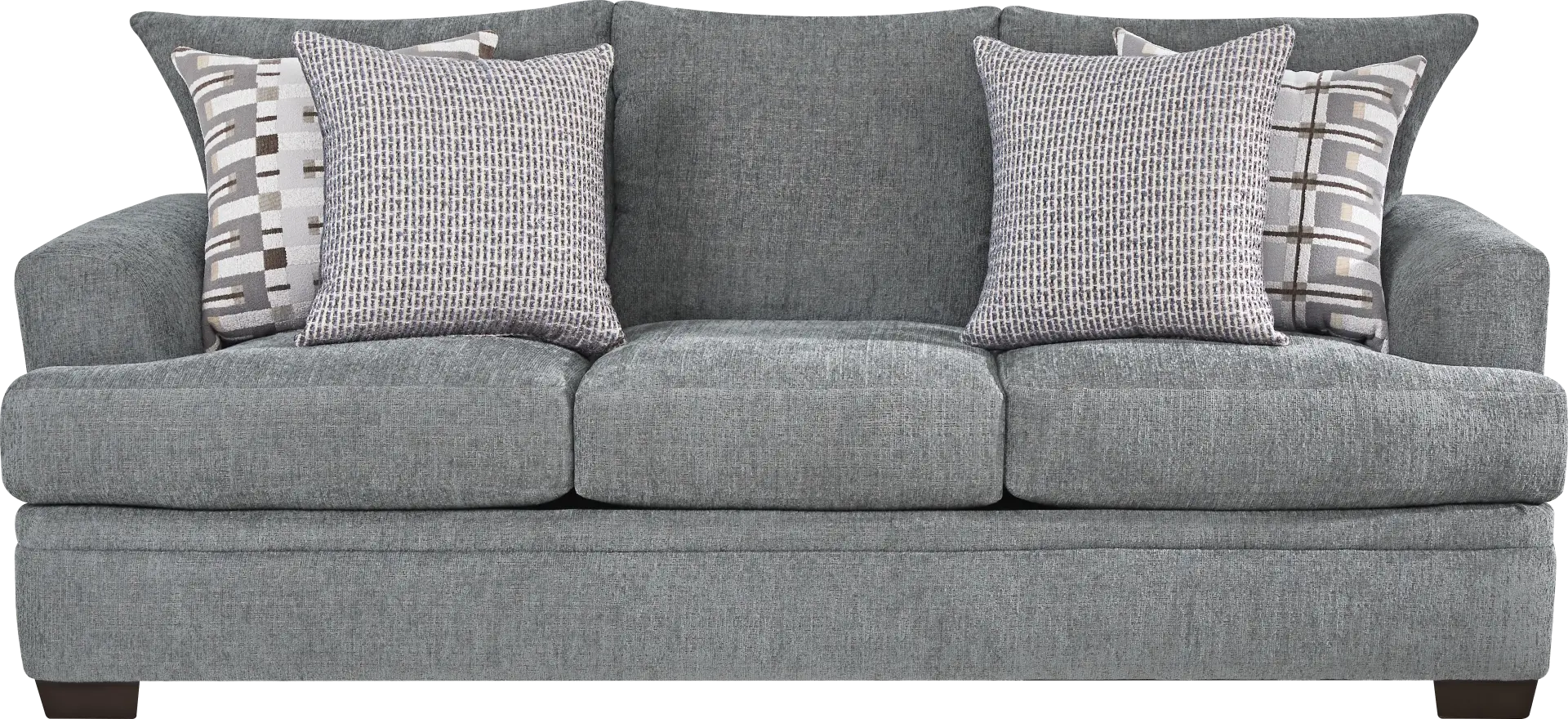 Poetic simplicity woven with grace and charm into the coziest corners of daily life, the Cooper sofa's dapper lines and understated curves transform the ordinary into the sublime. This contemporary piece is upholstered in soft blue chenille, with gently sloping wedge arms hugging pillow-style back cushions. T-cushion seats extend past the arms for extra leg room. The base is accented with decorative wrap-around stitching to subtly highlight the seat design. Upholstery: 100% Polyester.