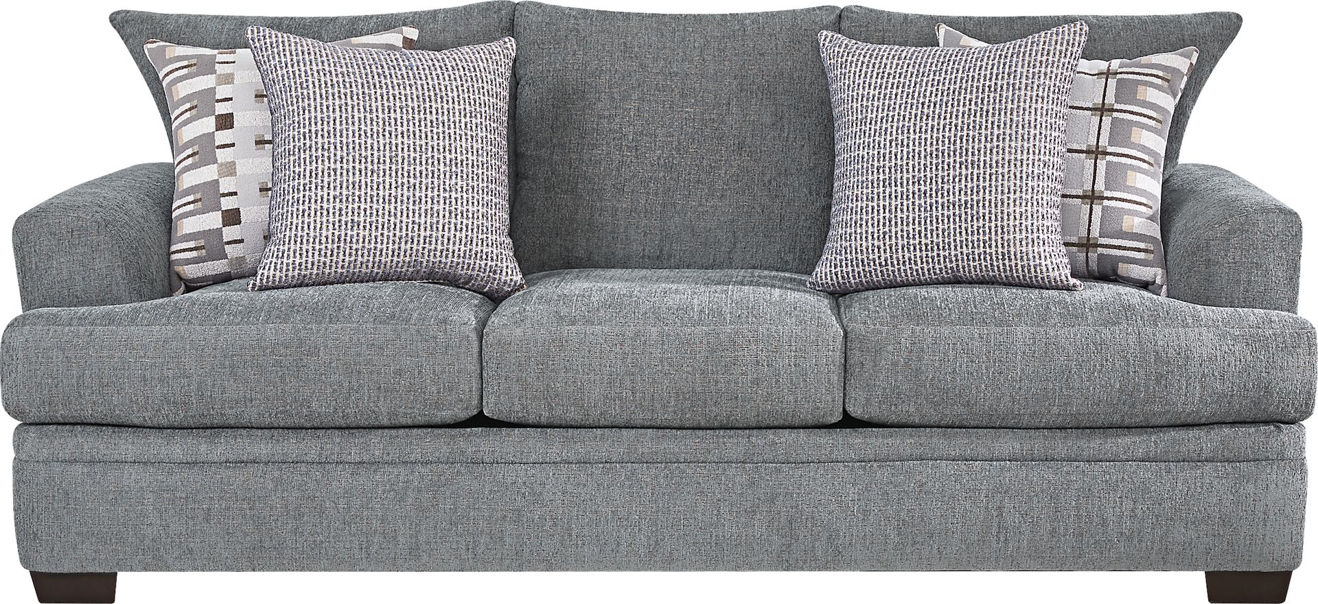Poetic simplicity woven with grace and charm into the coziest corners of daily life, the Cooper sofa's dapper lines and understated curves transform the ordinary into the sublime. This contemporary piece is upholstered in soft blue chenille, with gently sloping wedge arms hugging pillow-style back cushions. T-cushion seats extend past the arms for extra leg room. The base is accented with decorative wrap-around stitching to subtly highlight the seat design. Upholstery: 100% Polyester.