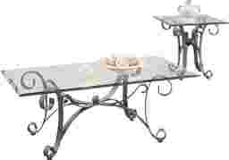 Curved and curled metal bases provide the Cooper table set with decorative interest. Beautifully finished with copper tint patina, the graceful bases are topped by beveled edge glass. Round center ball adds ornamental appeal. Partial assembly required.
