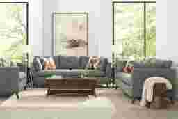 Mixing playful details with sumptuous craftsmanship, what's not to love about the Copenhagen collection from Drew & Jonathan? This handsome living room's mid-century modern style has a timeless look and feel with soft chenille upholstery in a soothing lagoon color. The sofa and loveseat have loose cushions outlined by subtle welting alongside back cushions with beautiful tufting and matching bolster pillows. Coordinating accent pillows add even more visual intrigue with an eye-popping pattern. The living room's casual elegance wouldn't be complete without the tapered legs on each piece, perfectly complementing the mid-century aesthetic. Upholstery: 100% Polyester. Cleaning Instructions: Use water based cleaning agents or foam.