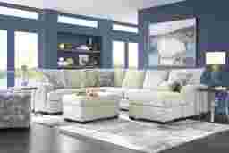 A sleekly designed place for friends and family to relax, the Copley Court sectional living room creates a contemporary and cozy place to sit. Upholstered with plush chenille fabric in a crisp shade of parchment beige, the sectional features tight slip over arms, reversible seat cushions and sumptuous seating perfect for lounging. The storage ottoman flips open to reveal a perfect place to keep linens or books tucked out of the way. Included accent pillows offer a colorful splash of blue, gray and beige. Upholstery: 91% Polyester, 9% Polyurethane. Cleaning Instructions: Use water based cleaning agents or foam. Small accent pillow not included.