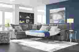 Sleekly designed, the Copley Court sectional creates a cozy, contemporary place to relax. Upholstered with plush chenille fabric in a chic shade of pewter gray, this sectional features tight slip over arms, reversible seat cushions and sumptuous seating perfect for lounging. Included accent pillows offer a colorful splash of blue, gray and beige. A built-in queen size mattress with gel foam comfort creates a convenient sleeping arrangement for overnight guests. Upholstery: 91% Polyester, 9% Polyurethane.