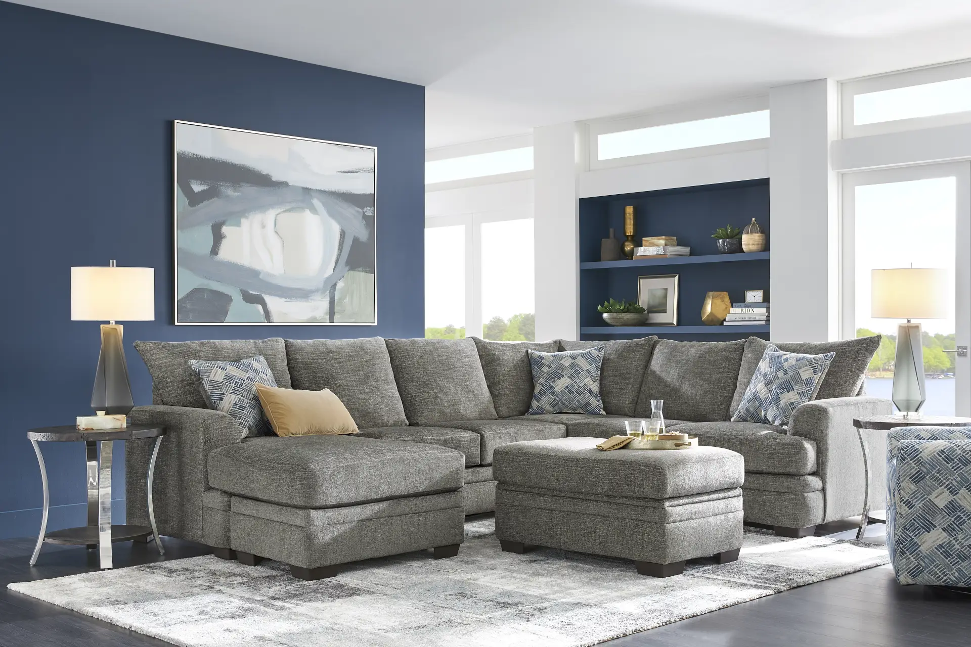 A sleekly designed place for friends and family to relax, the Copley Court sectional living room creates a contemporary and cozy place to sit. Upholstered with plush chenille fabric in a chic shade of pewter gray, the sectional features tight slip over arms, reversible seat cushions and sumptuous seating perfect for lounging. The storage ottoman flips open to reveal a perfect place to keep linens or books tucked out of the way. Included accent pillows offer a colorful splash of blue, gray and beige. Upholstery: 91% Polyester, 9% Polyurethane. Cleaning Instructions: Use water based cleaning agents or foam. Small accent pillow not included.