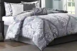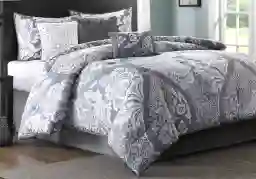 Classic and contemporary design combines in the chic Cora comforter set, resulting in a cozy stylish setting to rest, relax and recharge. An oversized leaf-inspired pattern takes center stage on the gray cotton sateen comforter and shams, while three decorative pillows feature pleating and embroidery details. The set includes one queen comforter, two standard shams, three decorative pillows and a bed skirt. 100% Cotton 200TC sateen printed on face, 180TC cross weavebacking, 270g/m2 poly fill. Machine wash cold, gentle cycle, and separately. Do not bleach. Tumble dry low, remove promptly. Do not iron. If there is no free movement in the washer or dryer, use large capacity commercial washer/dryer.