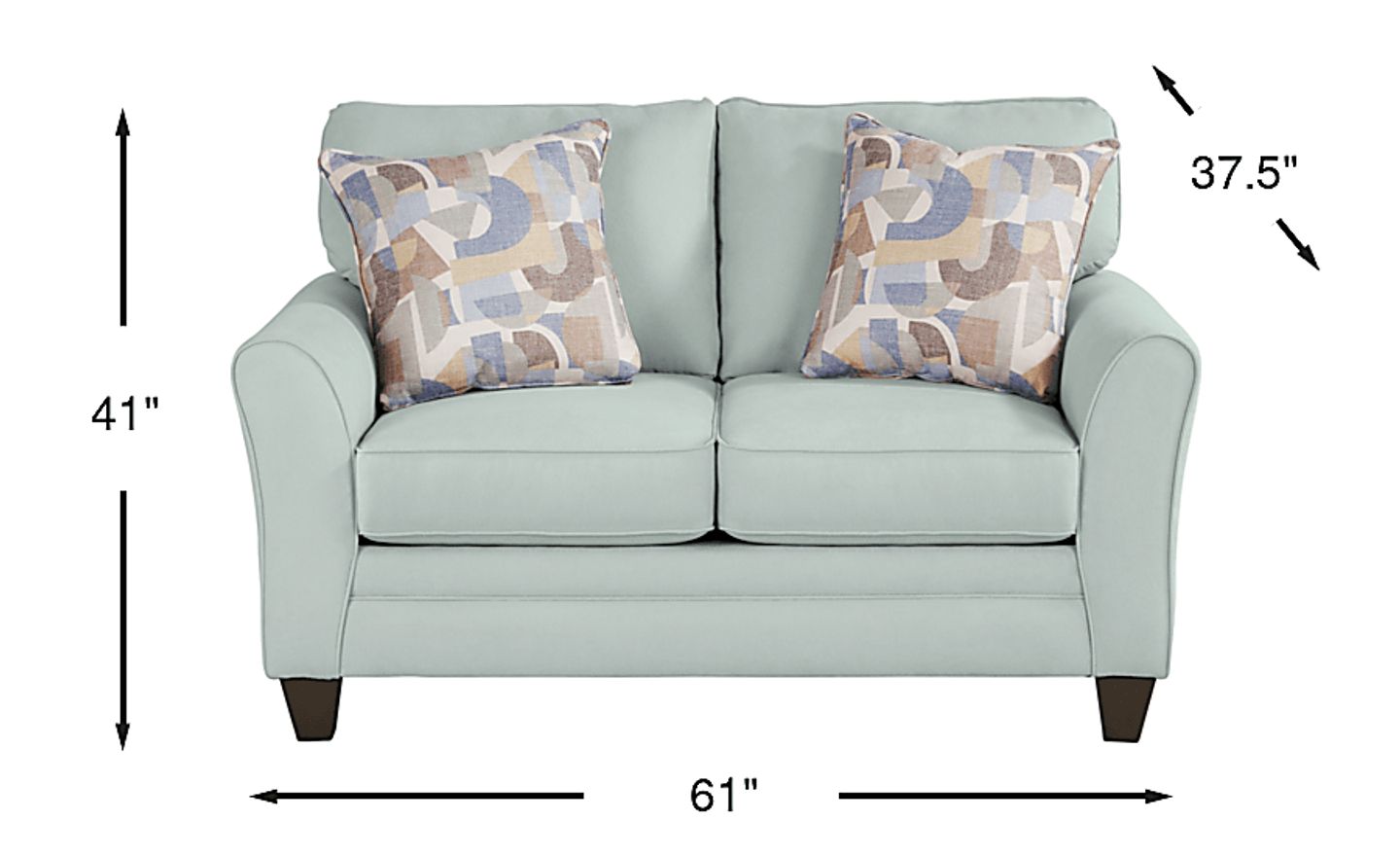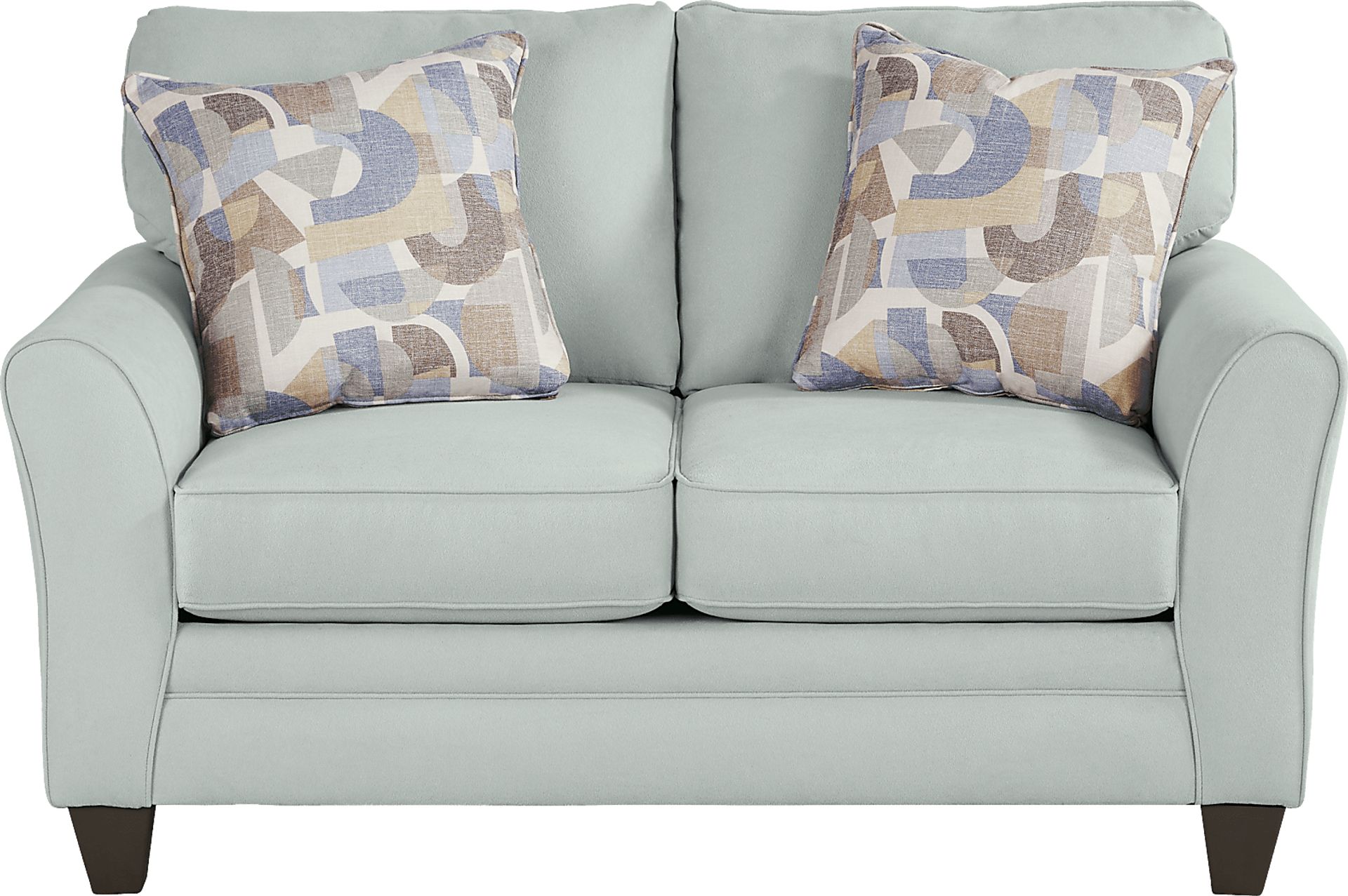 The soothing hues of the ocean meet the warmth of the sandy shore in the Coralville loveseat, a relaxing collection of soft curves, tranquil lines, and comfy cushions. This casual piece features brushed twill fabric in an arctic blue hue with subtle roll arms and welted seams throughout. Blue mosaic accent pillows add a gentle touch of style while tapered square legs in a warm brown finish perfectly round off the ensemble. Upholstery: 100% Polyester.