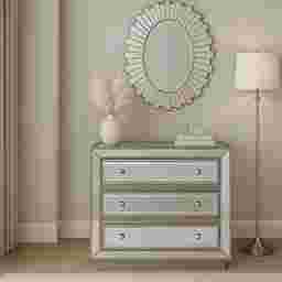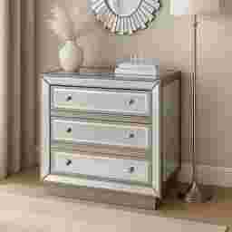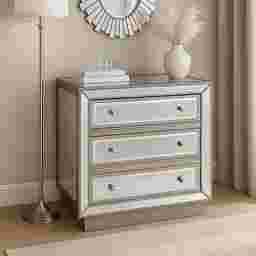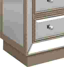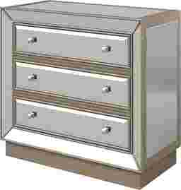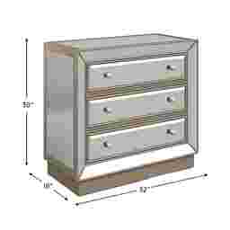 Ideal for bedrooms, living spaces and entryways, this Corlina storage solution adds a touch of contemporary fashion to any interior. Featuring three drawers of hidden storage and a spacious surface for mementos, lamps and more, organize your space with this eye-catching accent chest. Engineered wood provides a sturdy foundation while the mirrored finish makes your space feel brighter and bigger than ever. A finished posterior allows this accent chest to fit into your home at any angle. Smooth-gliding metal drawer runners are combined with chic details like mirrored steel hardware and beaded outlines. The champagne base and glass paneling require low-maintenance, non-abrasive cleaning methods to maintain their shine. Function and fashion are integrated to create this appealing addition to your home. Customer assembly is required.