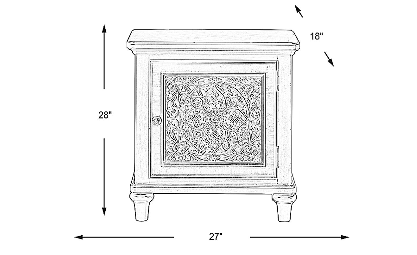 Presenting a beautiful design, the Cornelia door nightstand makes a stylish bedside companion. Boasting ornate carving details, the door opens to reveal a hidden compartment with a shelf. A knob with a silver-finished metal insert adorns the door. Crafted of oak veneers, this piece features a classic black finish. Elegant turned legs add the perfect finishing touch.