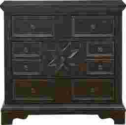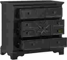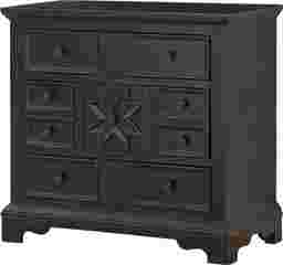 The rugged good looks of the Cornice's accent cabinet black textured finish are a match for any decor, and bring out the exquisite details on this three drawer chest. Window frame molding, matching metal hardware, and an eight pointed star add subtle design elements to the drawer fronts, and with the convenience of AC and USB ports on the back, a winning combination for your home.