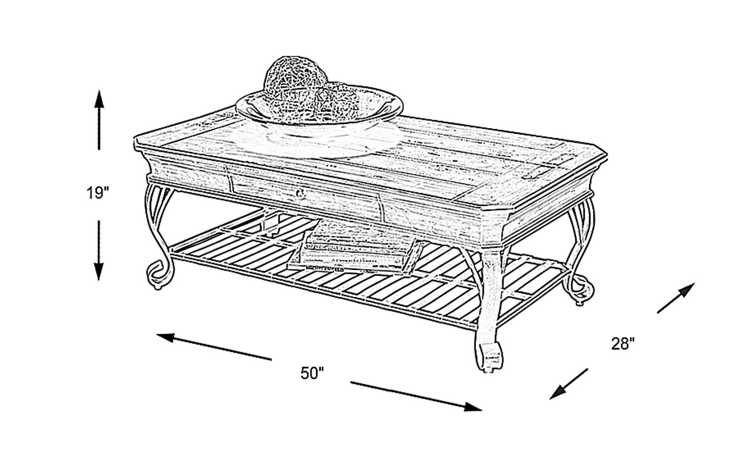 Featuring a rustic, distressed pine table top perched atop a beautifully curved iron base, the Coronado Bay cocktail table gives any room a warm, cozy feel. One side of the paneled pine table top lifts to reveal a hidden storage space, ideal for keeping electronics controllers out of sight. A small drawer on the table front and a large metal lower shelf offers additional storage space.