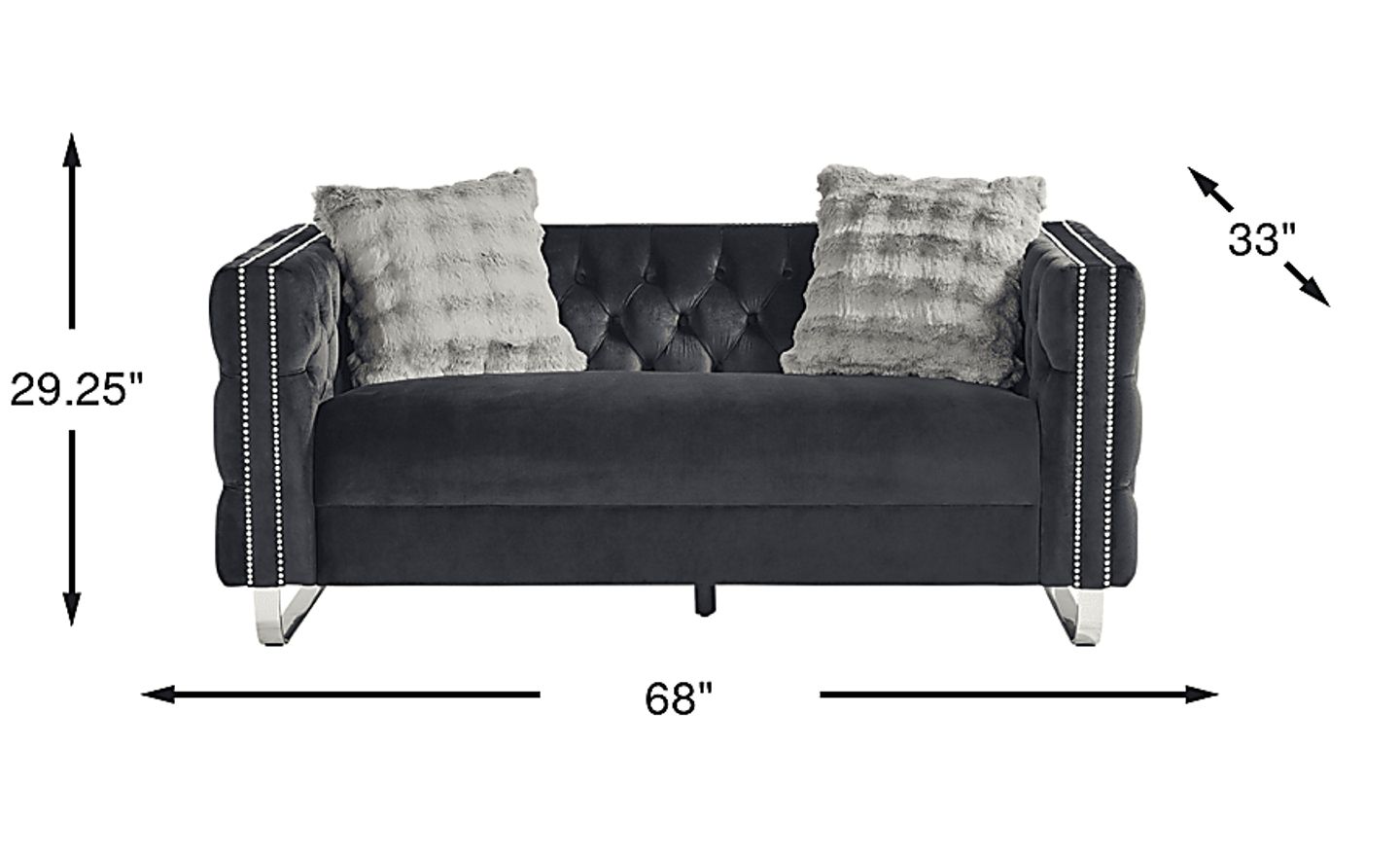 Bold glamour shimmering as a high-rise penthouse spreads a city-wide view comes to life in the Corrella collection, where dramatic design and chic details create a space that feels both indulgent and unapologetically upscale. Contemporary in style, this loveseat is upholstered in sumptuously soft black velvet, offering a bold and refined statement. Tuxedo arms and deep diamond tufting create a rich sense of opulence, while plush seating invites luxurious relaxation. Bright chrome-finished legs and nailhead trim add a touch of glamour, elevating the overall look with sophisticated shine. Upholstery: 100% polyester.