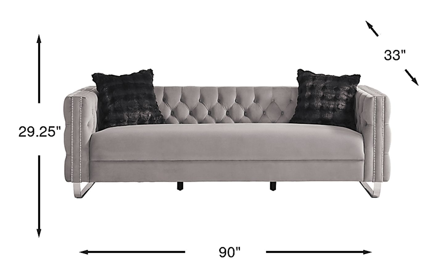 Bold glamour shimmering as a high-rise penthouse spreads a city-wide view comes to life in the Corrella collection, where dramatic design and chic details create a space that feels both indulgent and unapologetically upscale. Contemporary in style, this sofa is upholstered in sumptuously soft gray velvet, offering a bold and refined statement. Tuxedo arms and deep diamond tufting create a rich sense of opulence, while plush seating invites luxurious relaxation. Bright chrome-finished legs and nailhead trim add a touch of glamour, elevating the overall look with sophisticated shine. Upholstery: 100% polyester.