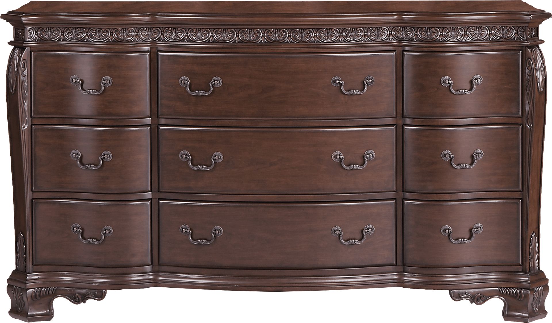 Practical and attractive, the oversized Cortinella dresser provides ample storage for clothing and personal items. It is made with cherry veneers and enhanced with a cherry finish and ornate carved detailing. Felt-lined top drawers protect delicate items. Design elements include drop handle hardware with antique style brushed finish and decorative feet.