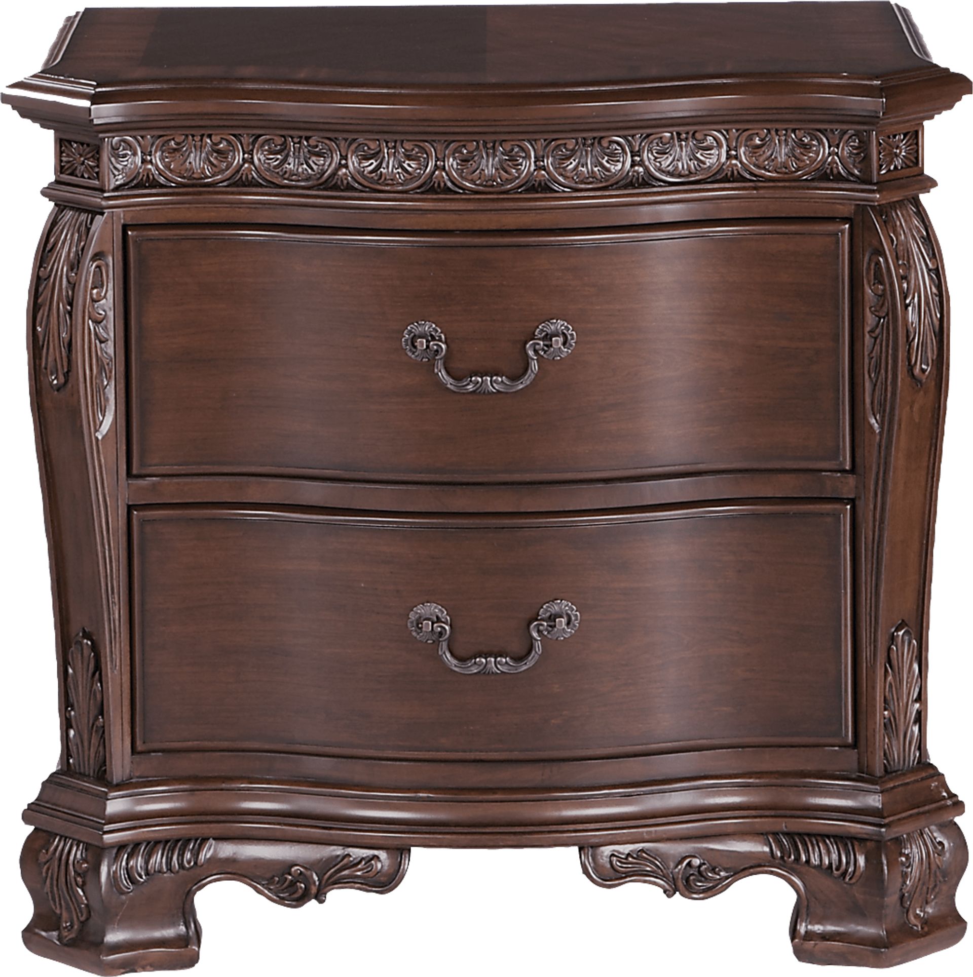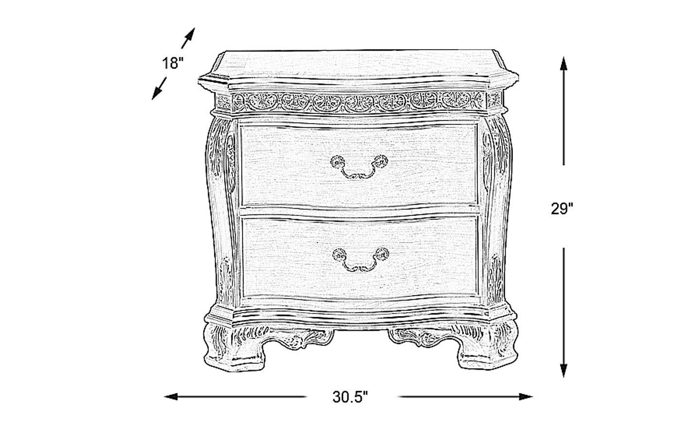 The Cortinella nightstand is a striking and useful piece. Made with cherry veneers with a classic cherry finish, the nightstand provides generous storage space. Antique style brushed hardware and elegant carved effects complement the classic European styling.