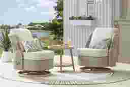 The clink of glasses, the sound of laughter, and the enchanting melody of intimate gatherings come to life with the Costa Mesa collection, wrapping each moment in the warmth of great style & great company. Rendered in weather-resistant aluminum frames, swooping barrel seat designs are covered in woven outdoor rope dyed a colorfast and UV-resistant beige. Seat backs are accented with a wide brown stripe, a perfect contrast against the light neutral pillow-style cushions. Upon taking their seat, guests will love the soothing swivel and rocking motions provided by the aluminum base and the charming hand-brushed woodgrain pattern it displays.