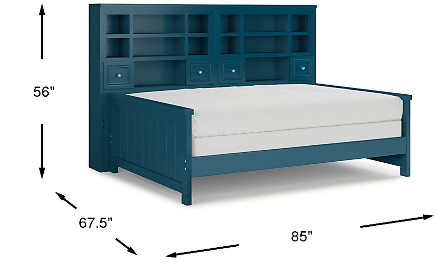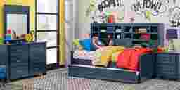 Make the most of the space in your child's bedroom with the Cottage Colors bookcase daybed. Featuring double bookshelves with open cubbies and drawers, there is plenty of space to store books or display collectibles. Showcasing a bold blue finish, the bed is detailed with beautiful paneling details for a timeless look. A dual height rail setting offers an adjustable height, growing with your child. Store an extra mattress in style with the matching trundle option, sold separately. Mattress and foundation (if required) sold separately. Bed shown is twin size.