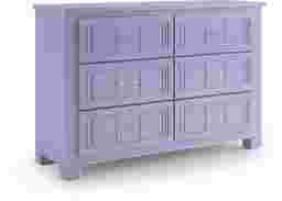 An attractive bedroom essential, the Cottage Colors dresser provides six generous drawers of storage. The piece is crafted of poplar solids with a pretty purple finish. Each drawer has paneling details and brushed nickel finished hardware with kenlin drawer guides for durability. Drawer pulls are rounded, and thanks to anti-tipping certification and curved edges, this dresser has added safety.