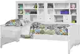 Make the most of the space in your child's bedroom with the Cottage Colors bookcase wall bed. Featuring double bookshelves with open cubbies and drawers, there is plenty of space to store books or display collectibles. Crafted of durable poplar solids in a lovely white finish, the bed is detailed with beautiful paneling. Store an extra mattress in style with the matching trundle option, sold separately. Mattress and foundation (if required) sold separately. Bunkie required for mattress support.