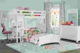 The Cottage Colors twin/full loft bunk offers a great look and fantastic value. This classic bunk keeps it simple with a traditional design that will never go out of style while including a built in desk that's perfect for homework. The chic white finish, pretty paneling detail and brushed nickel finished hardware add to the charm and ensure the room will remain appealing as your child grows. The bed below can accommodate an optional trundle storage drawer sold separately. Mattresses and foundations (if required) sold separately. Bunkie Boards required for mattress support.