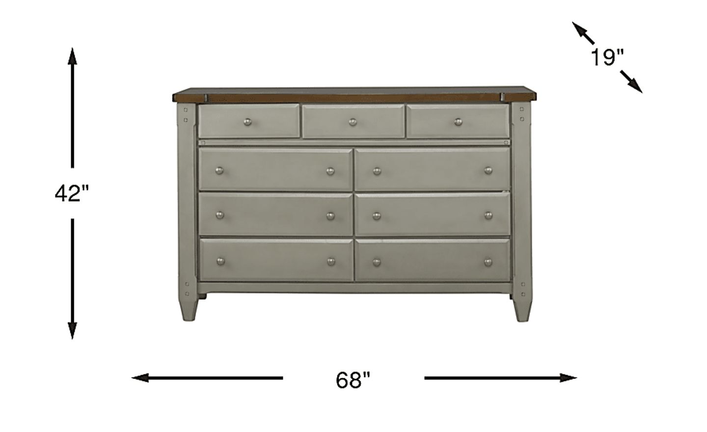 Keep daily necessities neatly organized with the Cottage Town dresser. This bedroom essential boasts relaxed, cottage styling with a gray finish and vertical panels on each side. Nine roomy drawers are made with French and English dovetail joints for strength and stability. Each drawer has round metal knobs. The dresser, made with poplar solids, features a contrasting top crafted with cherry veneers.